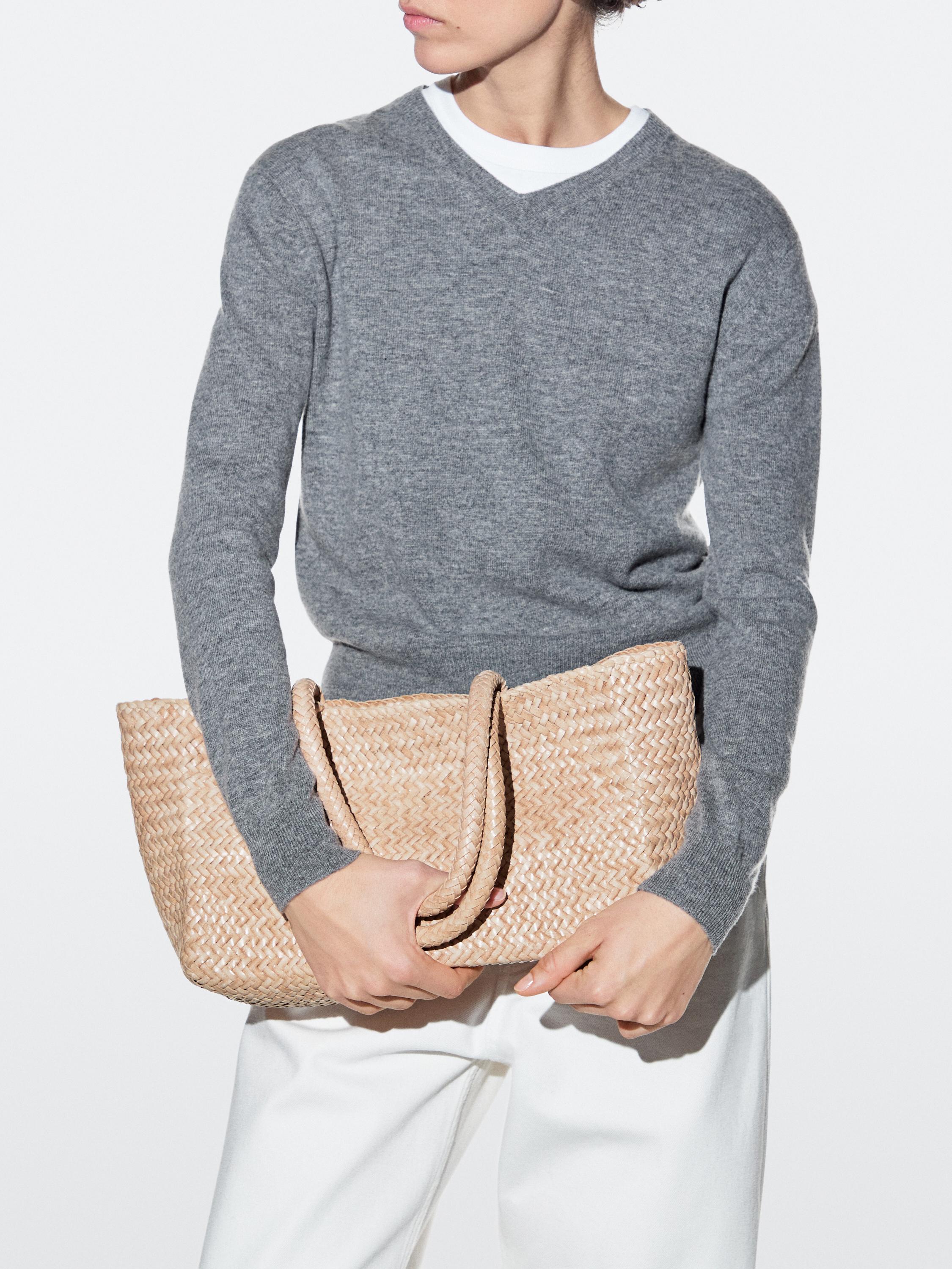 Beige ve gri tonlarında sade ama dikkat çekici bir detayla dikkat çeken bu örgülü tote, minimalist ve bohemian tarzda giyimlerin kalbinde yer edecek. Uzun govdeli tipler icin idealdir; hafif yuvarlak yapısı vucudun orijinal hatlarini bozmadan rahat bir dengesi vardir. Gündüz saatlerinde ofis-sonrasi bulusmalarda veya kahve gezip gelen bir günde, beyaz tisortle ve yuksek bel jean ile kombinle. Akşamleyin ise siyah bluz ve koyu mavi pantolonla daha serin bir hale getirebilirsin. Renk uyumu açısından gri tonuyla beigeden oluşan iki renk de temiz ve dengeli bir araya gelir. Aksesuar olarak siyah deri kemer ve beyaz sneaker ile tamamlayabilirsin. Kullanım kolaylığı açısından katlanmadan asmali, iç katman olarak da kullanılabilir. Daha az parca, daha fazla etki prensibine sadık kalan bir tasarımdır.
