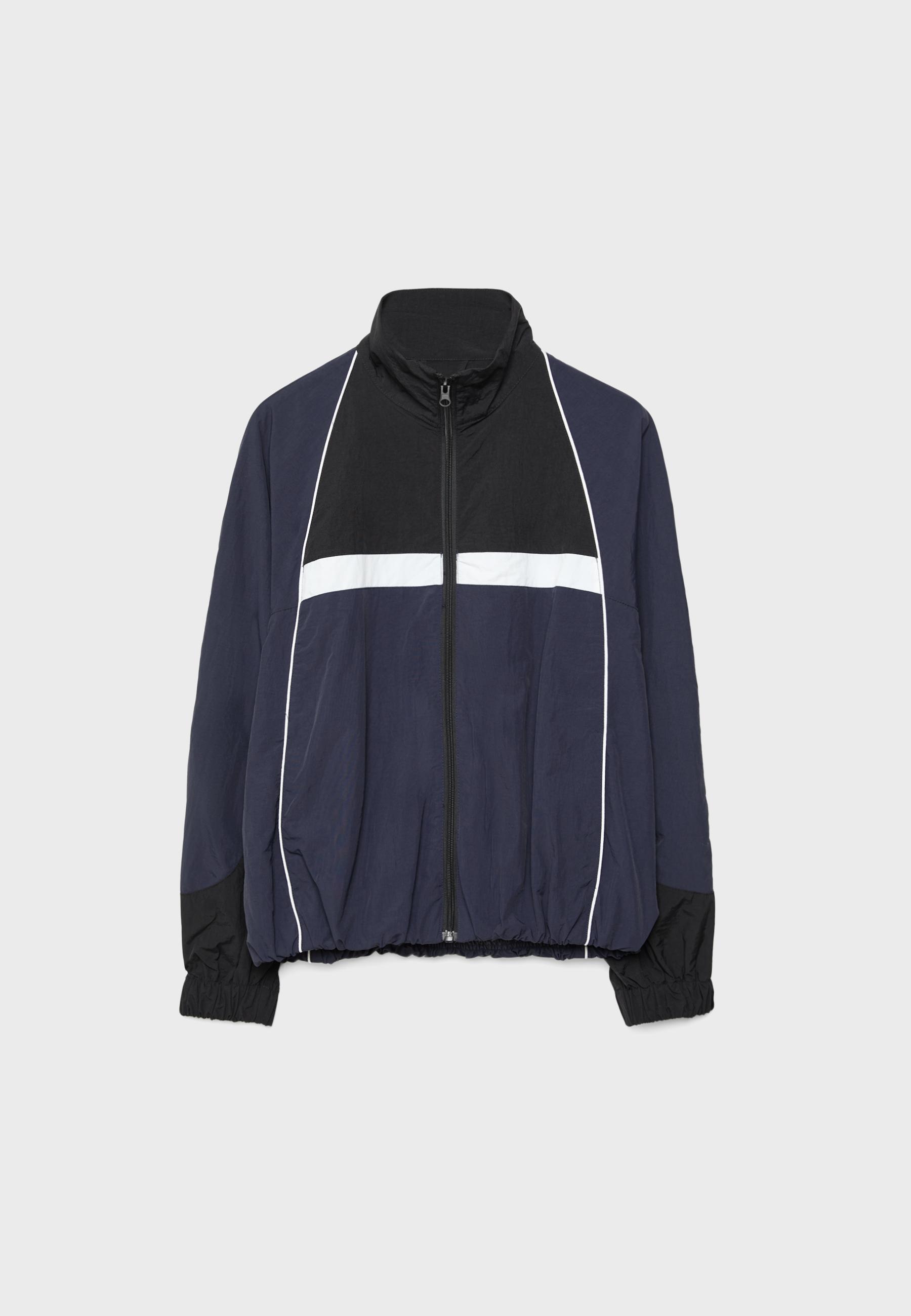 Yüksek yakalı ve manşetleri lastikli uzun kollu ceket. Önü fermuarlı. Etek ucu lastikli.