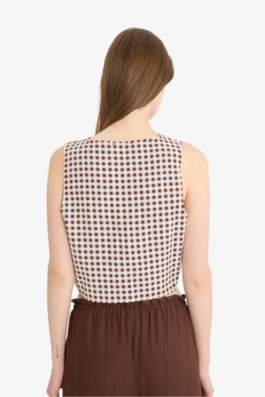 Fitted V Yaka Kareli Bağlamalı Pamuklu Kolsuz Bluz