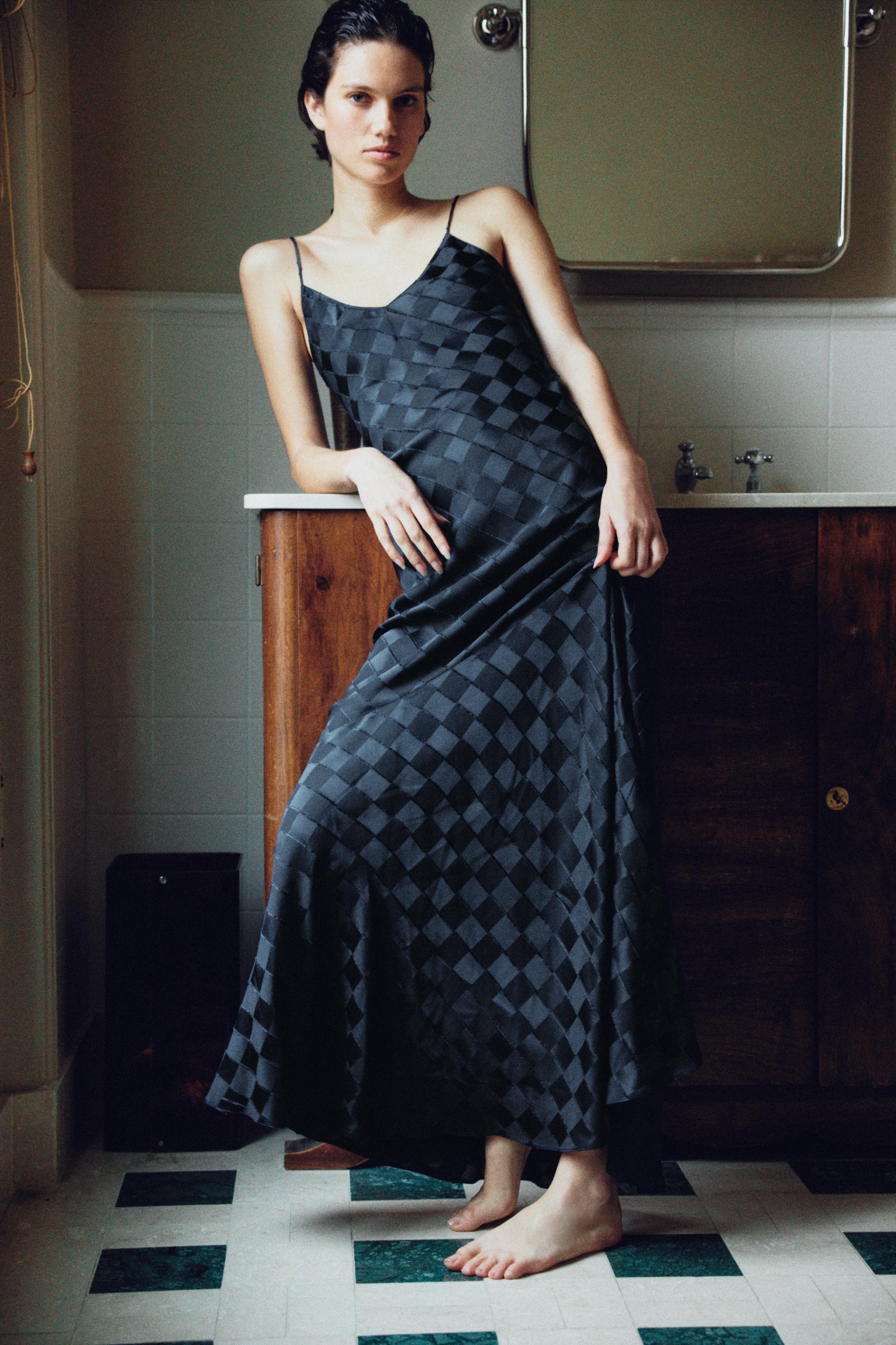 Bu elbise, sadece bir kıyafet değil, bir anlatı. Temiz hatları ve ince detaylarıyla, her zemine uygun, hemen hemen her zaman giyilebilir bir konforun içinde. Rozet deseni, gizli bir ışık gibi dikkat çekiyor ama aşırı olmayan bir etki yaratıyor. Klasik yapısıyla hem gece partilerinde hem de özel bir akşam yemeğinde ideal. Uzun gövdeli tipler için idealdir; vücut hatlarını netleştiren kesimi, uzunluğu dengeleyip daha da şıklık kazandırır. Geniş omuzlara sahip olanlar için ise, bu elbisenin yüksek yaka kısmı omuzların dengelenmesine yardımcı olur. Beyaz tisörtle ve yüksek bel jeans ile gündüz bir alışverişe, ya da siyah deri kemer ve beyaz sneaker ile ofis-sonrası bir buluşmaya uygun bir kombin oluşturabilirsin. Aynı zamanda, koyu mavi bir kot pantolonla ve bacaklık takılarak daha rahat bir bohemian tarz da yaratabilirsin. Karanlık renklerin içindeki parlayan rozet deseni, aksesuar seçimlerini kolaylaştırır. Aşırı süslemeye gerek kalmadan, basit bir altın bilezik ve açık renk bir çanta ile tamamlayabilirsin. Elbise, katlanmadan asılmalı ve nemli ortamlardan uzak tutulmalı. İç katman olarak da kullanılabilir; yani aslında bir çok stilin temel taşından biri.
