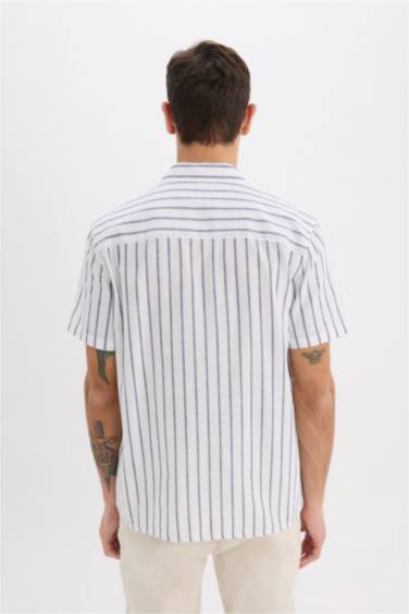 %100 Pamuk Regular Fit Yazlık Polo Yaka Keten Görünümlü Çizgili Kısa Kollu Gömlek