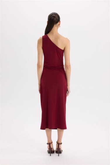 Bodycon Vücudu Saran Basic Düz Tek Omuzlu Bordo Midi Elbise