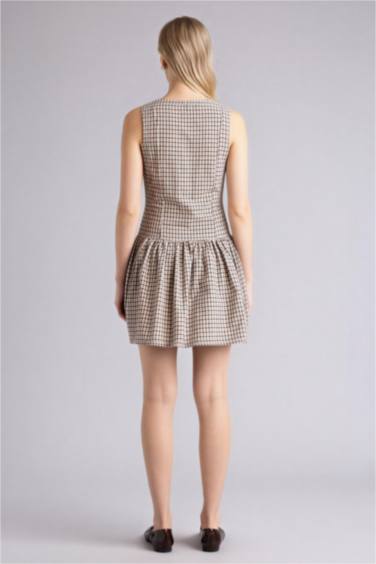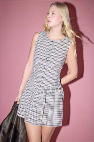 Bisiklet Yaka Kareli Pamuklu Kolsuz Mini Elbise