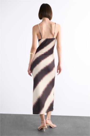 Fitted Vücudu Saran Desenli Yırtmaçlı Askılı Maxi Elbise