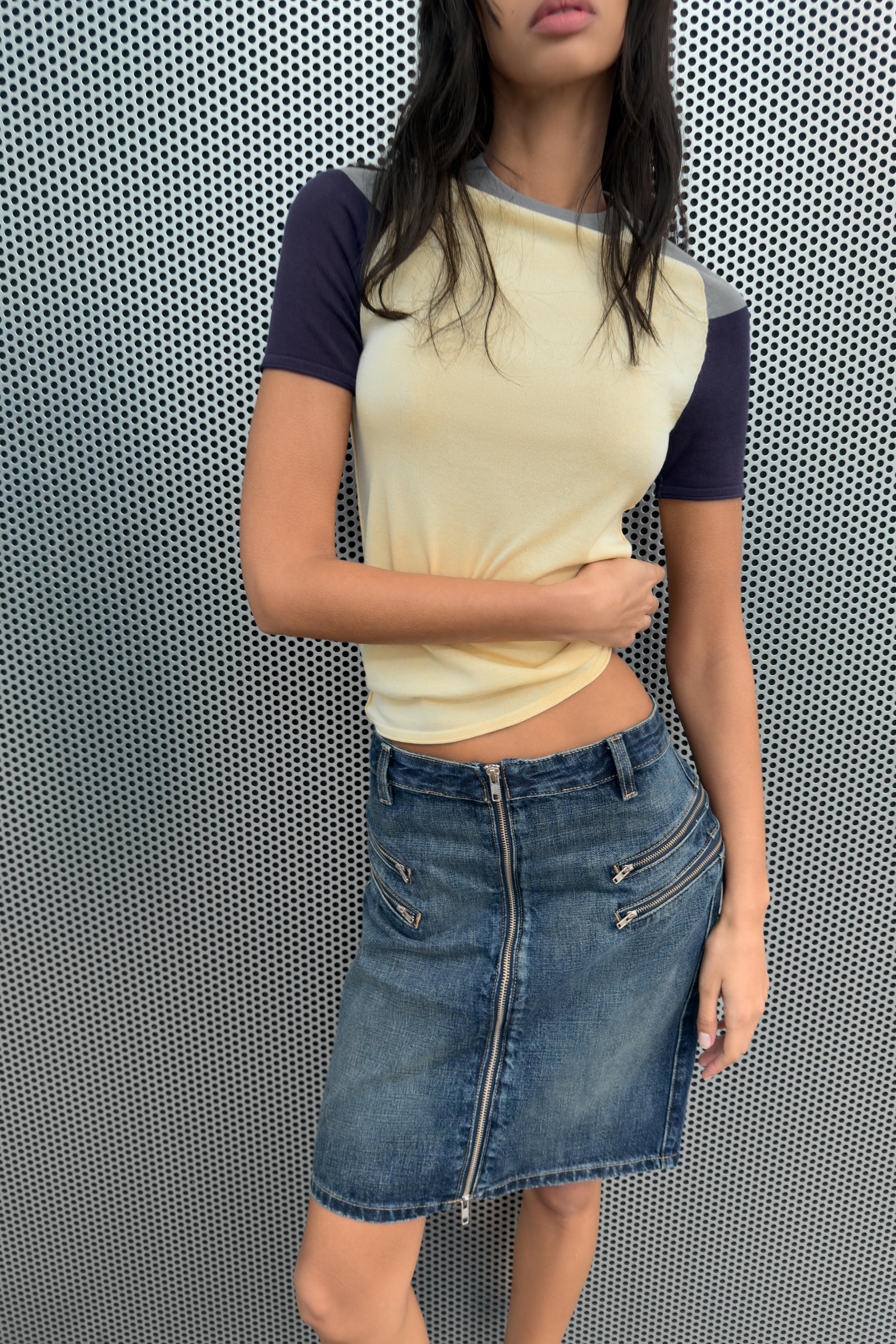 Blok renkli triko top, temiz ve sade bir estetikle dikkat çeken bir parçadır. Cream, navy ve gray tonları ile hem evrensel hem de kolay kombinlenebilir hale getirilmiştir. Uzun gövdeli tipler için idealdir; vücut hatlarını yumuşatırken aynı zamanda dengeli bir görünüm sunar. Kisa boylu bireyler için ise omuzların daha geniş görünmesini sağlar. Gün içinde ofis-sonrası buluşmalarda veya yemek ziyafetlerinde şıkça giyilebilir. Beyaz tisörtle ve yüksek bel jeans ile casual bir tarz oluşturabilirsin; aynı zamanda siyah pantolonla da daha serin bir hava yakalayabilirsin. Renkleri arasında uyum sağlayabilmek için aksesuarlarda notr tonlara yönel. Siyah deri kemer ve beyaz sneaker ile tamamlayabilirsin. Üzerine açık renkli bir ceket takarak mevsim geçişlerinde de kullanabilirsin. Katlanmadan asmalı, nemli ortamlardan uzak tutmalı ve elde yıkamalısın. İç katman olarak da kullanılabilir, sıcak havalarda rahat bir üst giyecek olarak tercih edilebilir.