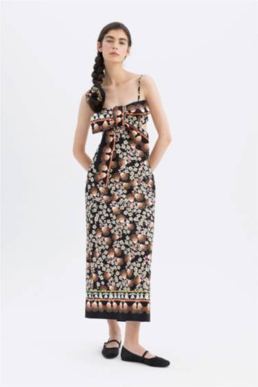 Lug Von Siga x DeFacto Bodycon Desenli Askılı Poplin Midi Elbise