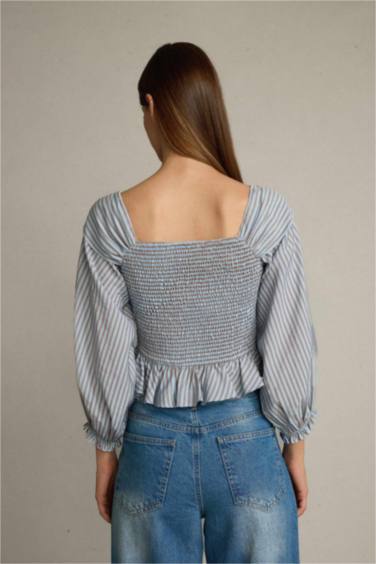 Kayık Yaka Fiyonk Detaylı Çizgili Uzun Kollu Bluz