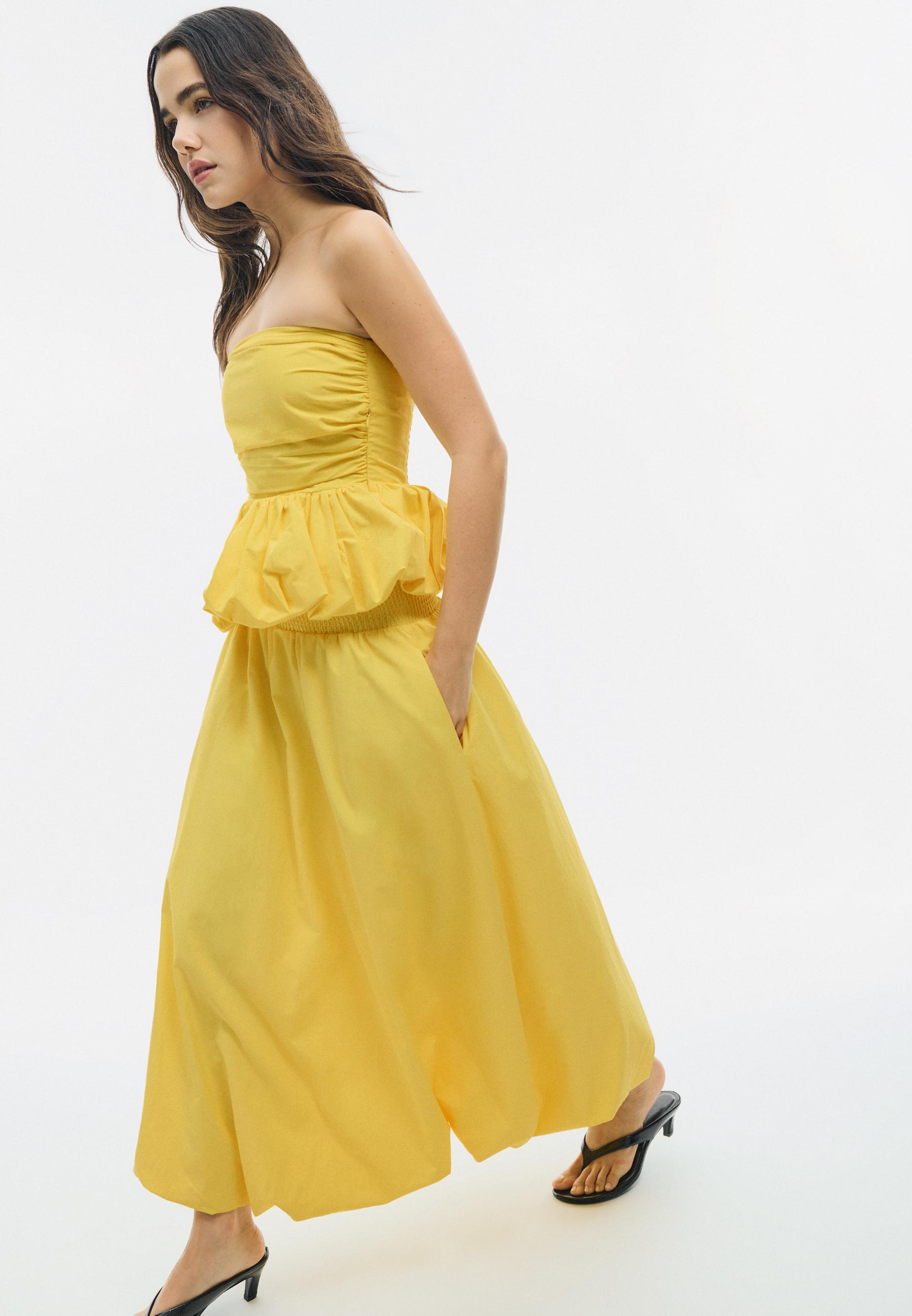 Sarı renkli uzun balon poplin etek, sade ama dikkat çekici bir dokunuşla gündelik ve özel günlerin her anını ayakta tutabilir. Temiz hatları ve hafif sarkmasıyla, hem rahat hem de şık bir görünüm sunuyor. Uzun gövdeli tipler için idealdir; omuzlarına doğru genişleyen kesimi vücut hatlarını dengeler ve daha uzun bir boy algısı yaratır. Güneşli bir yaz sabahı veya ofis-sonrasi bir kafe buluşturmasında, beyaz tisörtle ve yüksek bel jeans ile kombinleme yapabilirsin; bu karışım, hafif bohem bir hava taşır. Aynı zamanda, açık yaka bir bluz ve beyaz sneakerla da çok şık bir casual look oluşturur. Sarı rengi, aksesuarlarla dengelenerek daha zarif bir hale gelebilir; siyah deri kemer ve altın yüzük gibi minimal detaylarla tamamlayabilirsin. Eteği katlamadan asmalı, nemli ortamlardan uzak tutmalı ve iç katman olarak da kullanabilirsin. Zamanın ötesinde, sadece bir parça değil, bir tarz deklarasyonu.