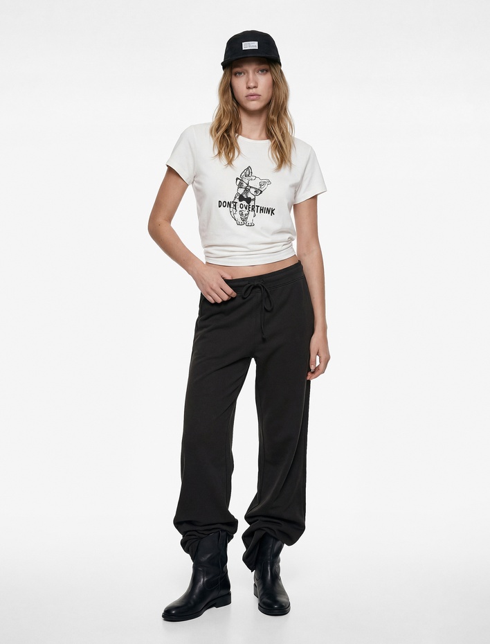 Slim Fit Pamuklu Kısa Kollu Bisiklet Yaka Köpek Baskılı Tişört