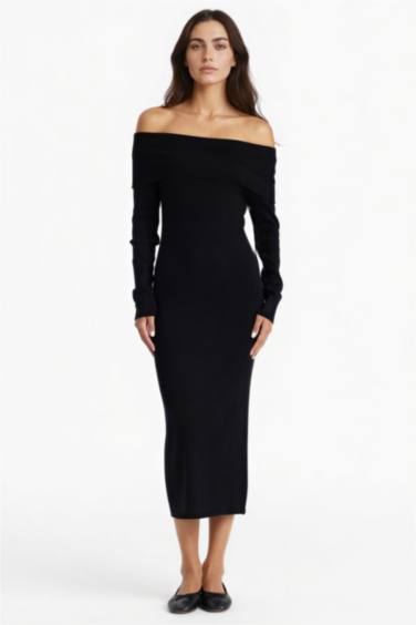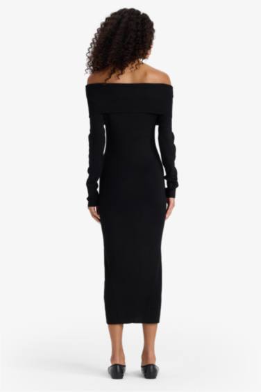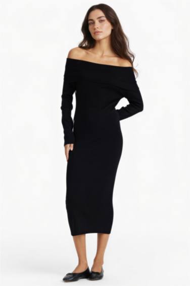 Fitted Açık Omuz Ribana Uzun Kollu Midi Elbise