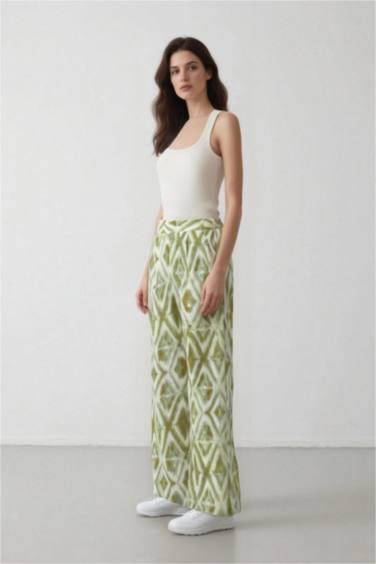 Relax Fit Viskon Kumaş Pantolon Desenli Cepli Geniş Paça Krinkıl