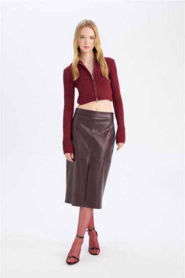 Yüksek Bel Penye Astarlı Yırtmaçlı Midi Suni Deri Bordo Kalem Etek