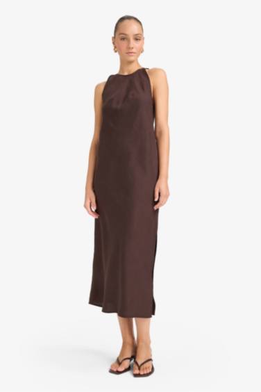 Halter Yaka Keten Kolsuz Maxi Elbise