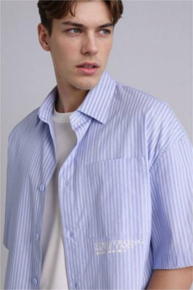 Boxy Fıt Polo Yaka Baskılı Çizgili Kısa Kollu Gömlek