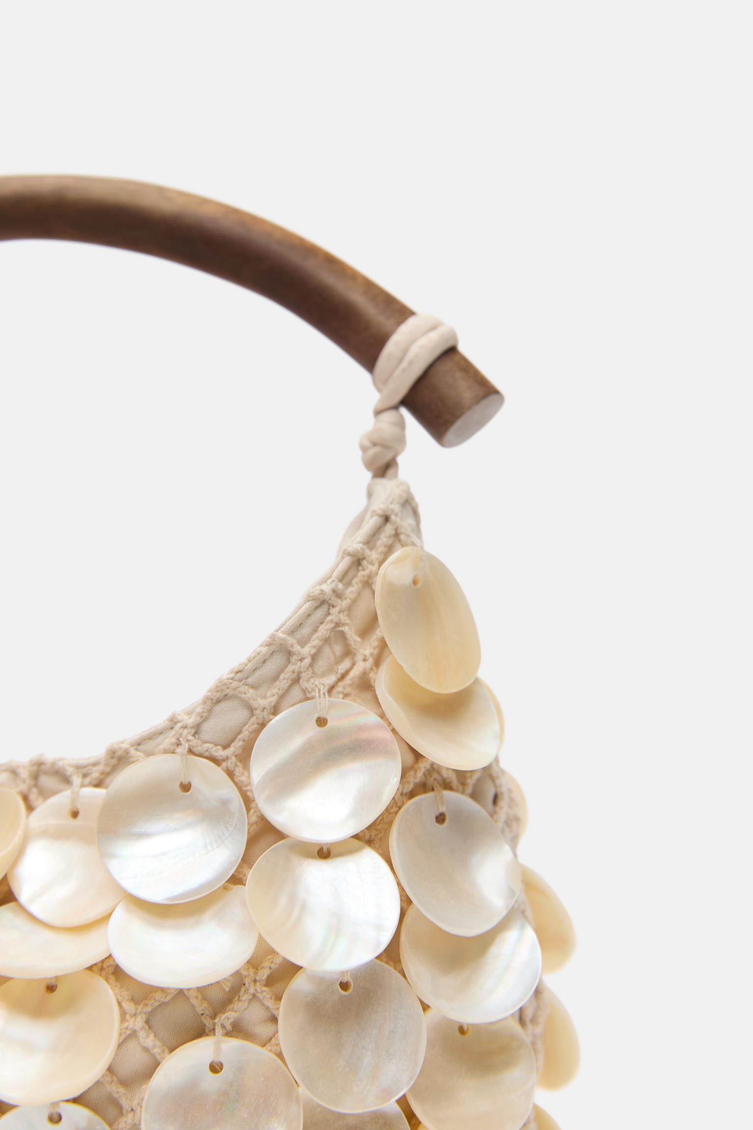 Ekru renk el çantası. Boncuk ve file detaylı. Ahşap görünümlü kumaş el askılı. Mıknatıslı kapamalı. <br/><br/>Yükseklik x Genişlik x Derinlik: 12.2 x 20.8 x 6.8 cm.