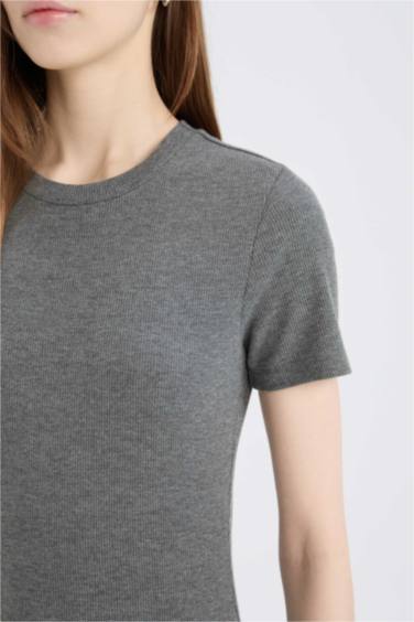 Bodycon Vücudu Saran Bisiklet Yaka Basic Düz Fitilli Kaşkorse Kısa Kollu Midi Elbise