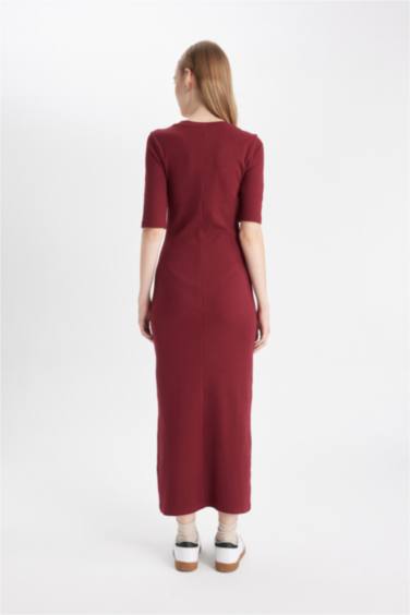 Bodycon Vücuda Oturan Bisiklet Yaka Basic Düz Fitilli Kaşkorse Kısa Kollu Maxi Bordo Elbise