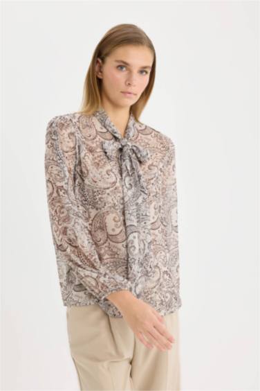 Regular Fıt Fiyonk Yaka Şal Desenli Şifon Uzun Kollu Gömlek