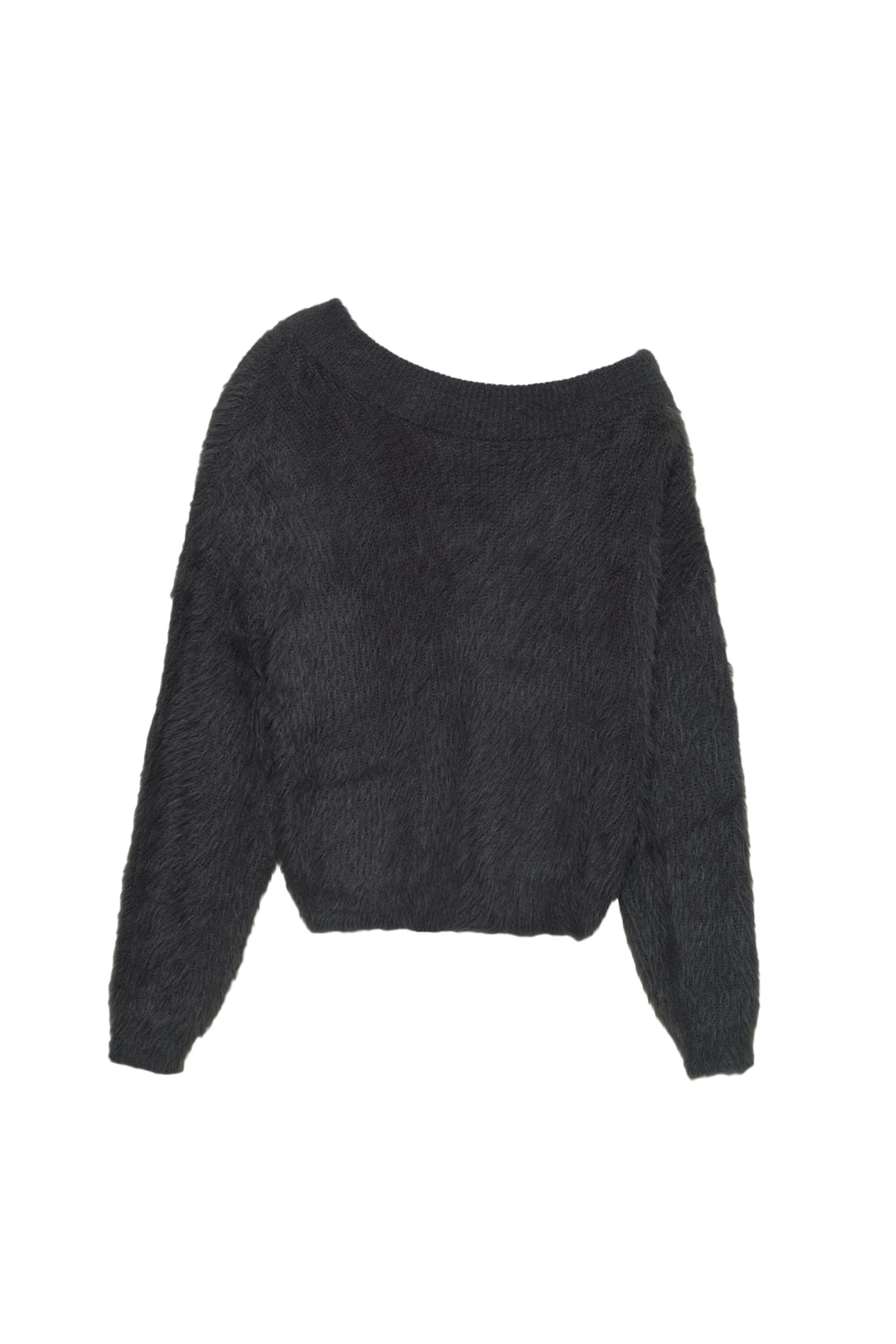 Yumuşak örgü, asimetrik kesimli, suni kürk görünümlü, geniş yaka, uzun kollu ve fitilli bitişli kazak.
