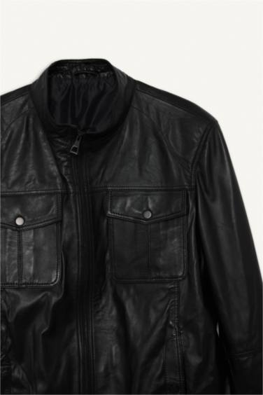 %100 Deri Premium Slim Fit Dar Kesim Dik Yaka Astarlı Fermuarlı Mont