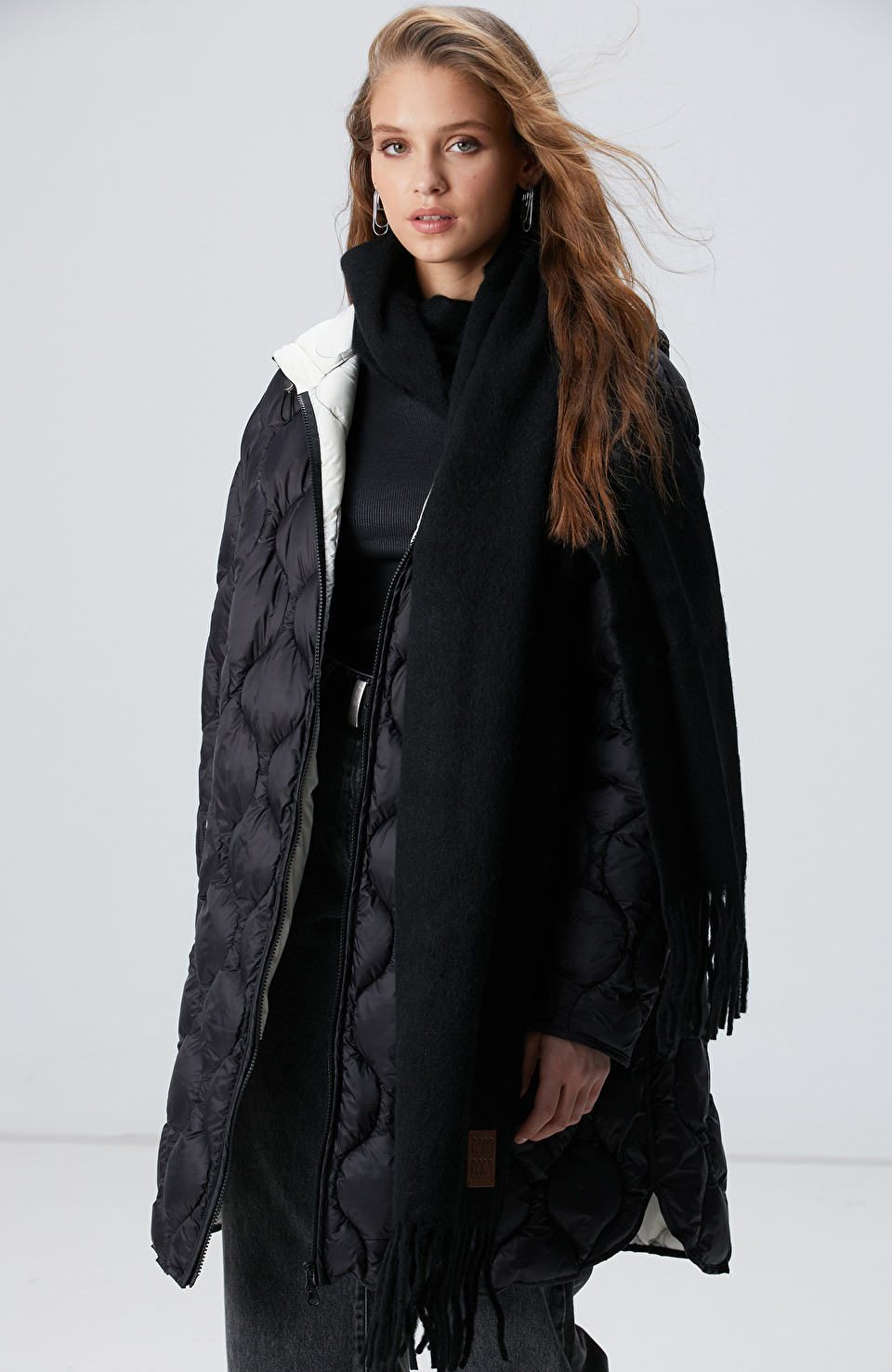 Siyah bir yün karışımı şal olarak, klasik ve minimalist tarzda tasarlanmış. Temiz hatları ve basit yapısıyla her giysinin içine kolayca sığar; aynı zamanda dikkat çekici bir dokunuş sağlar. Uzun gövdeli tipler için idealdir çünkü omuzlara hafifçe yayılan yapısı vücut çizgilerini dengeleyip daha dengeli bir görünüm sunar. Bahar ve kış aylarında ofis-sonrası buluşmalarda veya şehir içinde rahat bir yürüyüşte kullanmak için harika. Beyaz tisörtle ve yüksek bel jeans ile kombinleme, gün içinde doğal bir elegans yaratır. Aynı zamanda açık yakalı bluzla bohemian tarzda da giyilebilir. Siyah deri kemer ve beyaz sneaker ile tamamlayarak modern bir görünüm elde edebilirsin. Kurutma makinesinden uzak tutarak, katlanmadan asmalı. İç katman olarak da kullanılabilir, hem sıcak hem de stilist bir eklenti olur.