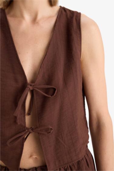 Regular Fit V Yaka Bağlamalı Krinkıl Kumaş Kolsuz Bluz