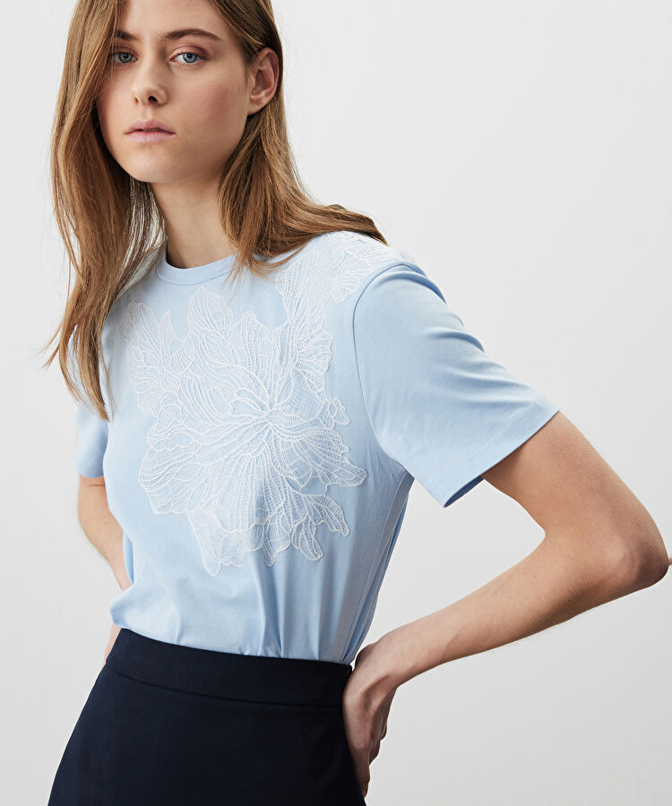 Ipekyol dantel aplikeli tişört, sade ve zarif bir denge sunuyor. Light blue ve white renkleriyle hem doğal hem de şık bir görünüm sağlıyor. Uzun gövdeli tipler için ideal çünkü dantelin hafif ağırlığı vücut hatlarını dengeliyor. Gün içinde ofis-sonrasi bulușmalarda veya yarım gün pikniklerde rahatça giyilebilir. Beyaz tisortle ve yüksek bel jeans ile kombinleme, minimalist ama etkili bir kombine. Aynı zamanda siyah deri kemer ve beyaz sneaker ile tamamlayarak daha dinamik bir hale getirebilirsin. Dantel detayını iç katman olarak da kullanabilirsin; bu sayede hem estetik hem de pratiklik sağlanmış olur. Üzerine ince bir blazer veya açık yakalı ceket takarak daha şık bir hale getirebilirsin. Kurutma sırasında dikkatli olmalı, katlanmadan asmalı, bu şekilde dokusu bozulmaz.
