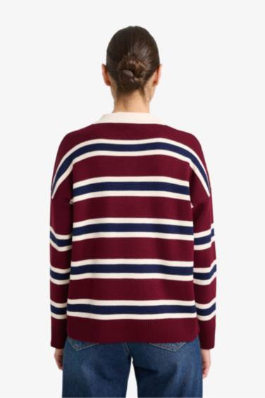 Oversıze Polo Yaka Çizgili Kazak