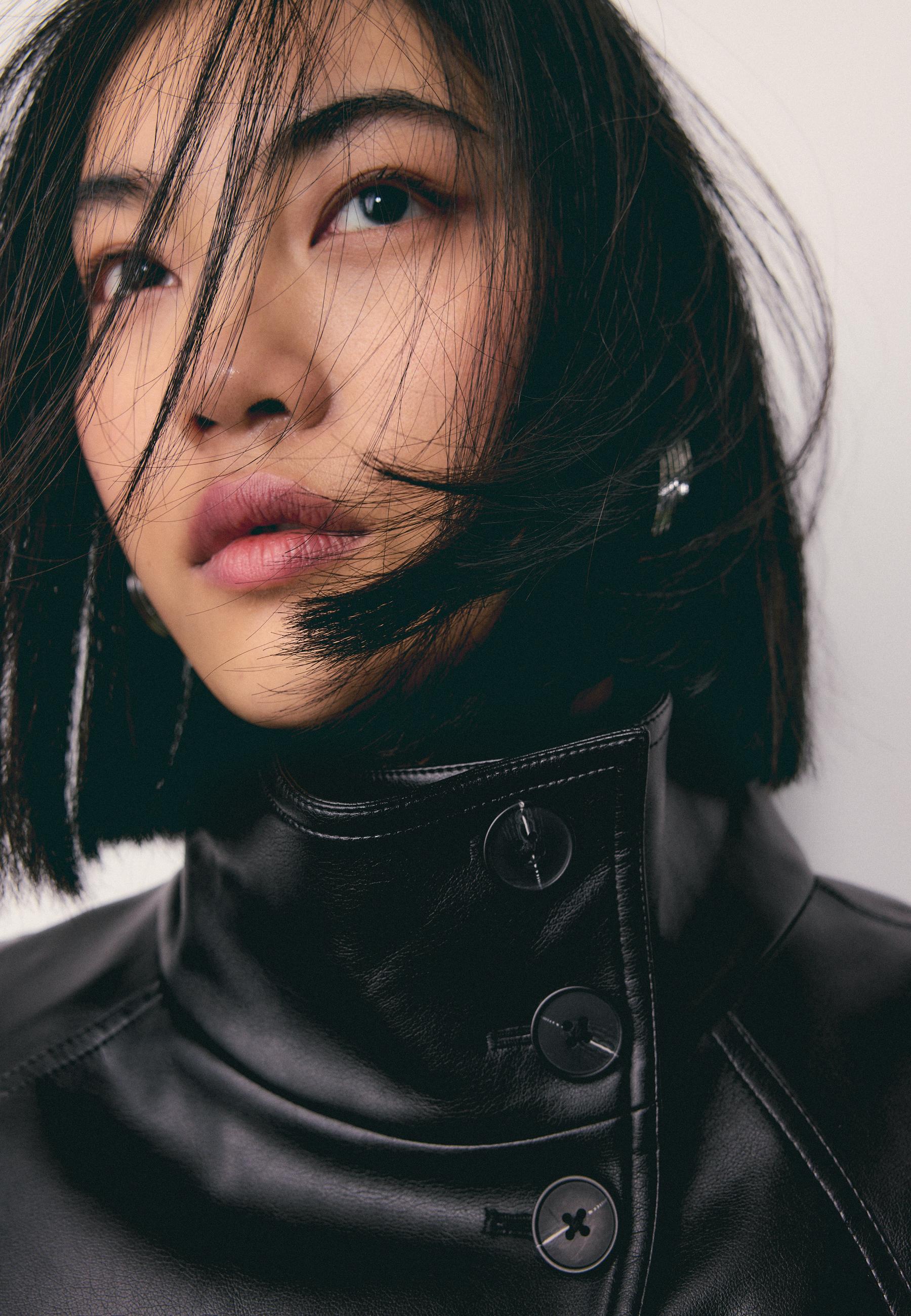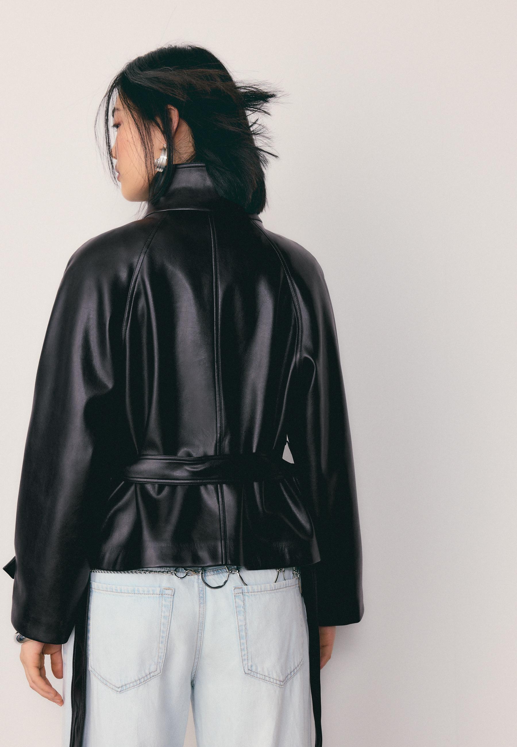 Kısa suni deri trençkot. Dik yaka ve ilikli ve düğmeli uzun kollu. Yan cepli. Düğmeli kruvaze ön kapama ve uyumlu kemerli. Çeşitli renklerde mevcuttur.