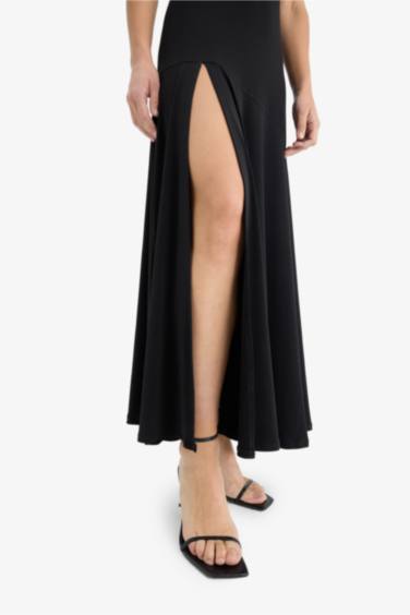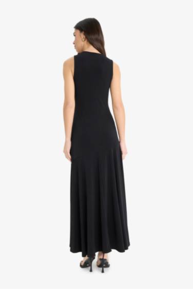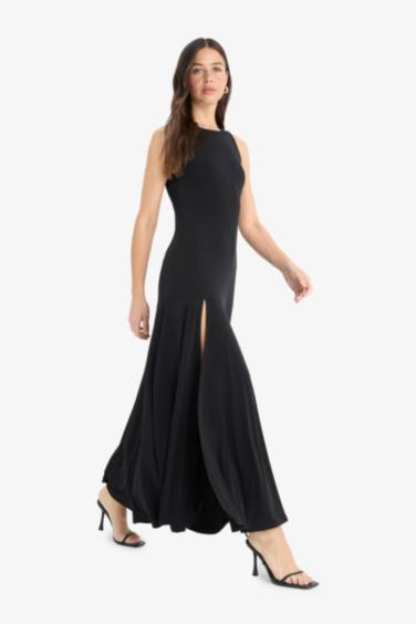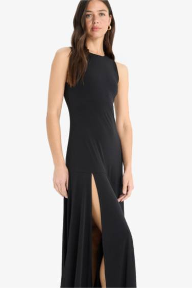 Bisiklet Yaka Yırtmaçlı Kolsuz Maxi Siyah Yazlık Elbise