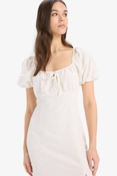 A Kesim V Yaka Keten Karışımlı Yırtmaçlı Kısa Kollu Midi Yazlık Elbise