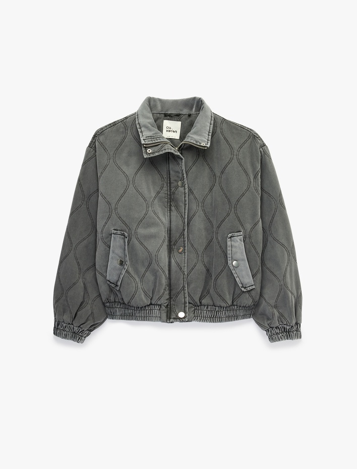 Cepli Yıkamalı Uzun Kollu Dik Yaka Fermuarlı Kapitoneli Ceket