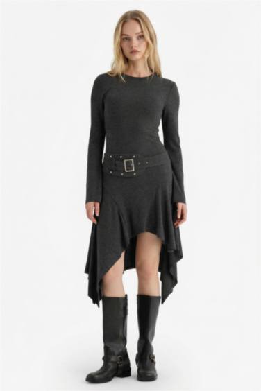 Bisiklet Yaka Uzun Kollu Midi Elbise