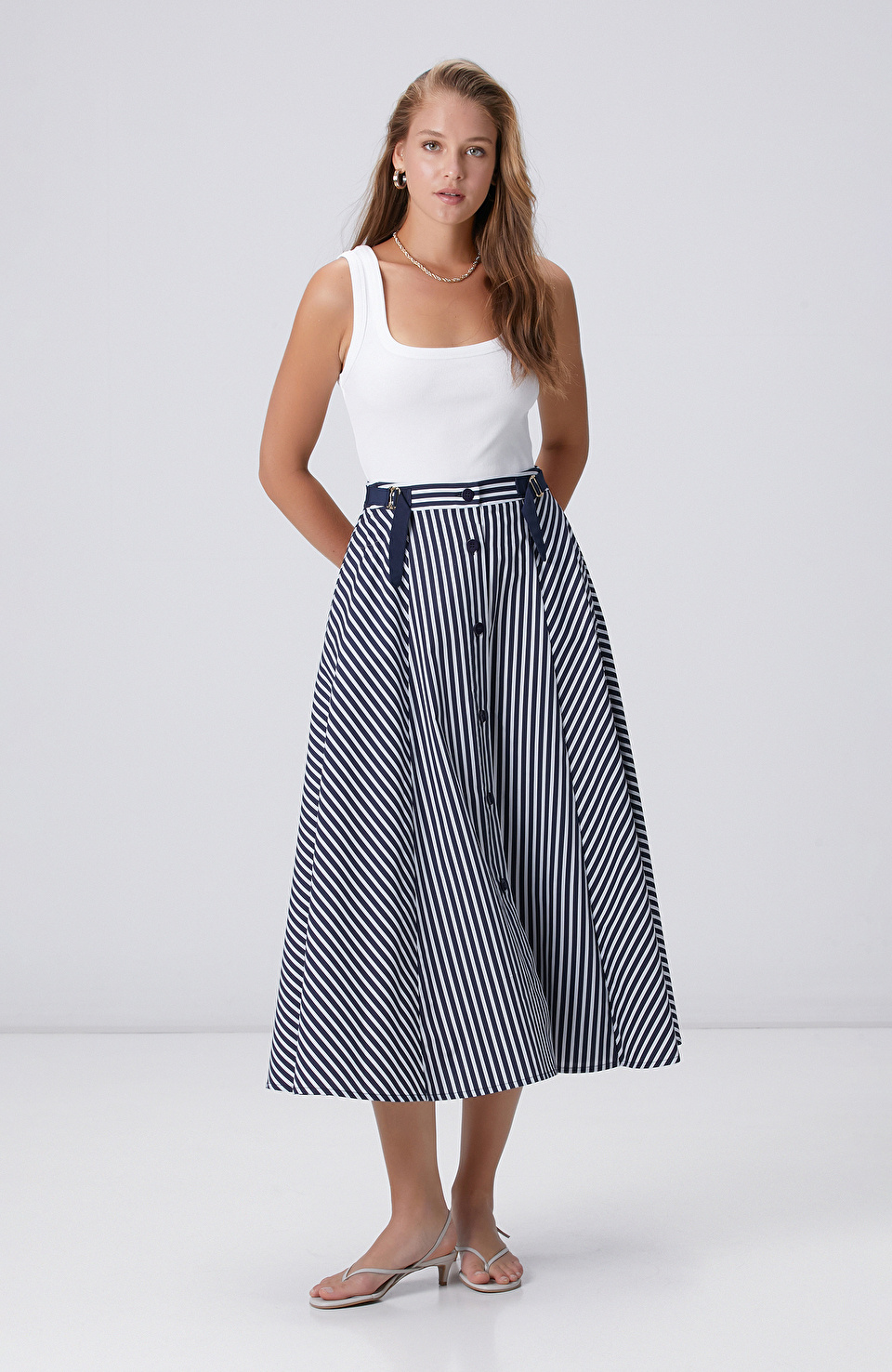 Lacivert Kırık Beyaz Çizgi Desenli Midi Etek