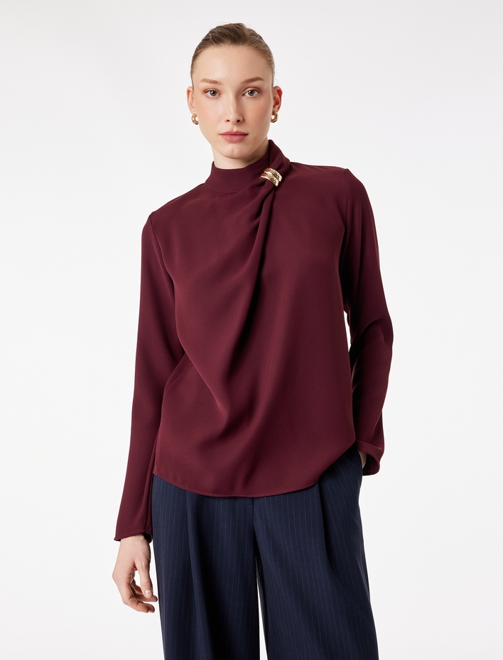 Metal Aksesuarlı Asimetrik Yaka Uzun Kollu Bluz — koton | Oneri