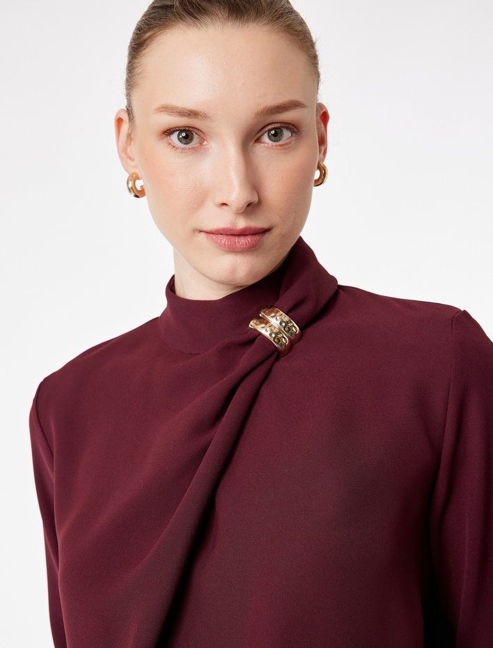 Metal Aksesuarlı Asimetrik Yaka Uzun Kollu Bluz
