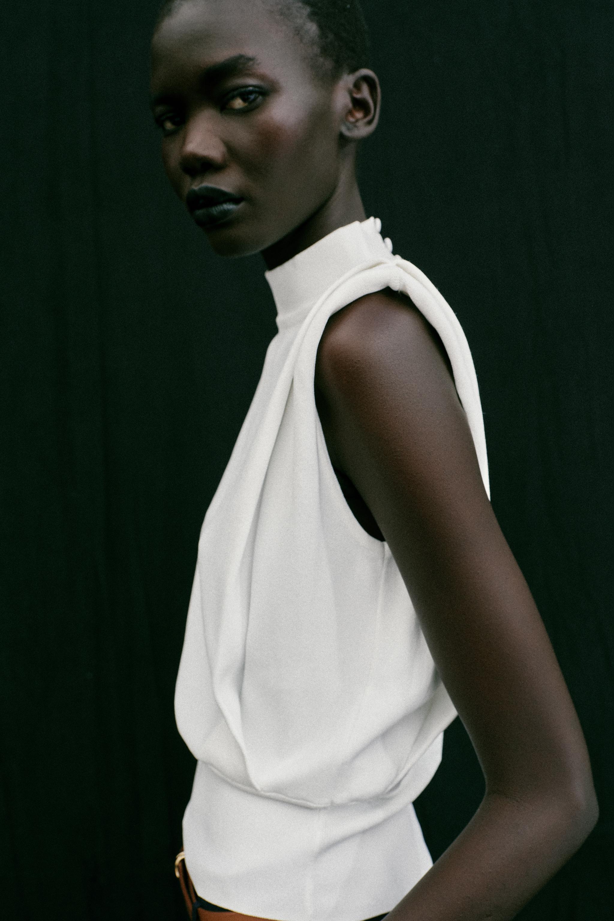 Sırtı dekolte olan bu triko top, temiz hatlar ve minimal detaylarıyla modern bir klasikin en iyi örneğidir. Uzun gövdeli tipler için idealdir; omuzları dengeli bir şekilde destekleyerek vücut hatlarını zarifçe vurgular. Sıcak havalarda açık bir bluzun altına veya kabanın içine giyilebilir; soğuk günlerde ise bol bir kazakla kombinlenebilir. Beyaz tisörtle ve yüksek bel jeans ile gündelik bir görünüm elde edebilirsin; aynı zamanda siyah deri kemer ve beyaz sneaker ile ofis-sonrası bir buluşturma için de uygun. Renk olarak sade ama etkili; aksesuarlarla da kolayca uyarlanabilir. Kuru temizleme önerilir; katlanmadan asmalı, iç katman olarak da kullanılabilir.