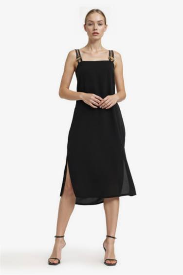Kare Yaka Krep Kısa Kollu Midi Elbise