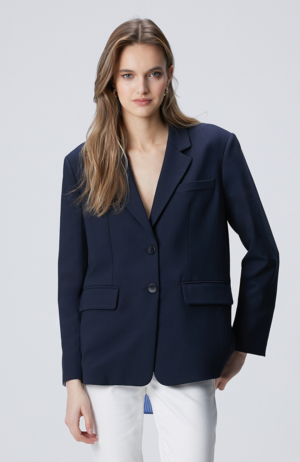 Lacivert ceket, temiz hatlari ve sade detaylariyla bir klasik kiyafetin modern bir versiyonu. Uzun govdeli tipler icin idealdir; ceketin uzunlugu vucudun orantilariyla dengelenir ve hafif bir cesitlik yaratir. Beyaz tisortle ve yuksek bel jean ile kombinleme, ofis-sonrasi bulusmalarda veya hafif bir yuruyuste cok etkili olur. Ayni zamanda, siyah deri kemer ve beyaz sneaker ile tamamlayarak daha dinamik bir look da yaratabilirsin. Ceketi katlanmadan asmali, hem giyimde hem de depolamada pratiklik saglar. Gunesli gecelerde ya da sonbahar aksam yuruyuslerinde de cok uygun bir secimdir. Navy rengi, notr tonlara ve beyazla cok iyi uyusur; aksesuar olarak da klasik ve sade secenekler tercih edilmeli.
