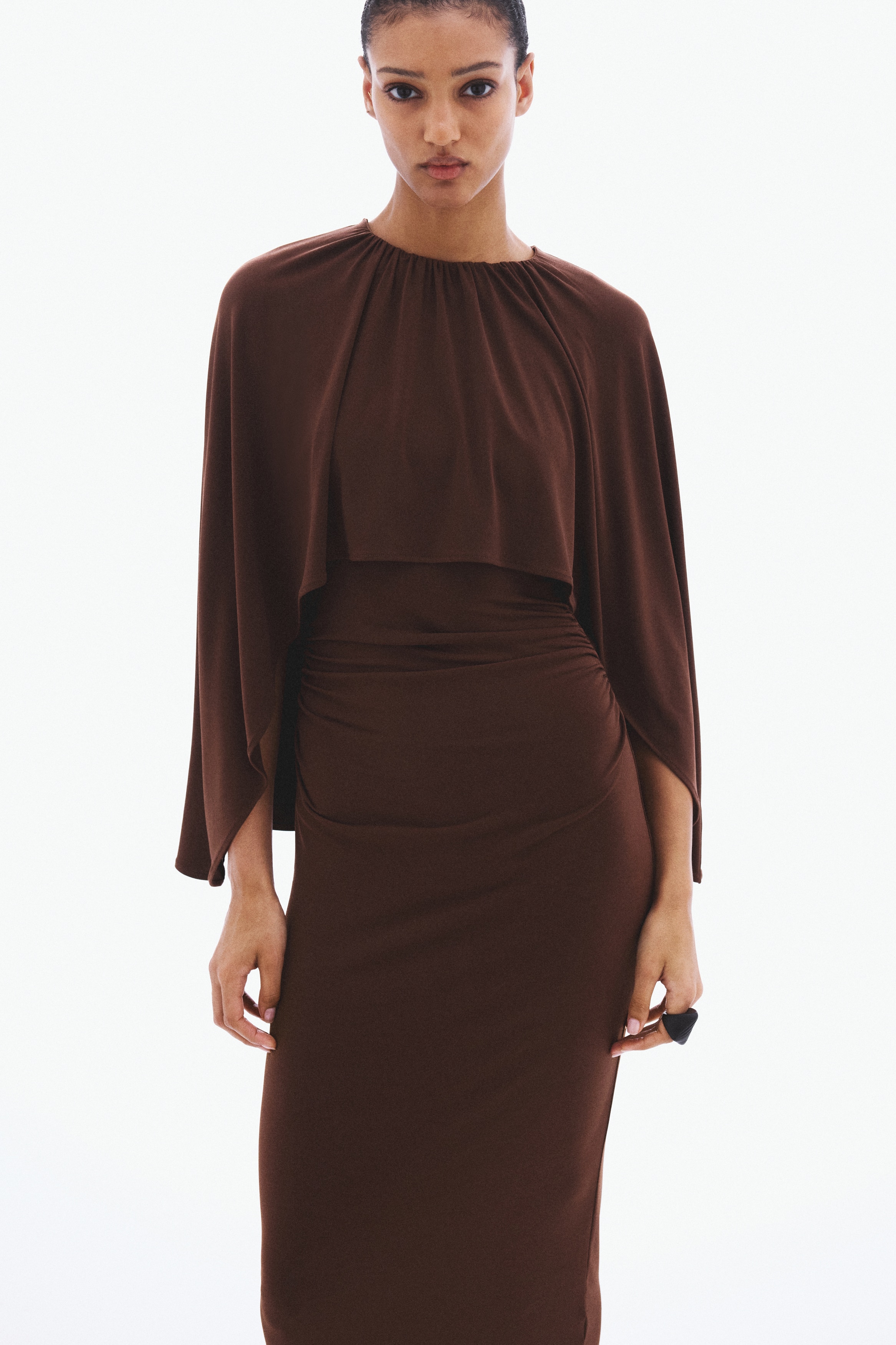 Bu pelerin detaylı ve drapeli elbise, sadece bir giysiden çok bir dekorasyon niteliğinde. Temiz ve dengeli çizgileriyle minimalist tarzın en iyi temsilcilerinden biri. Uzun govdeli tipler icin idealdir; omuz hizasinda kesimle vucudunuzu hafifletir ve dengeli bir gozukum saglar. Kombin yaparken belli bir esneklik arayacaksanız, beyaz tisortle ve yuksek bel jean ile kombinleme yapabilirsiniz. Bu klasik ve modern bir denge olur. Ayni zamanda, siyah deri kemer ve beyaz sneaker ile tamamlayarak daha casual bir gozukum de yaratabilirsiniz. Koyu kahverengi rengi, sonbahar ve kis mevsimlerinde cok uygun. Parti veya ikinci buluşmalar gibi gece ortamlarinda cok etkili olur. Bakim acisindan, katlanmadan asmali ve nemli bir yerde saklamali. Icin katman olarak da kullanılabilir, bu da onu kapsul gardirop icin cok degerli kilar.