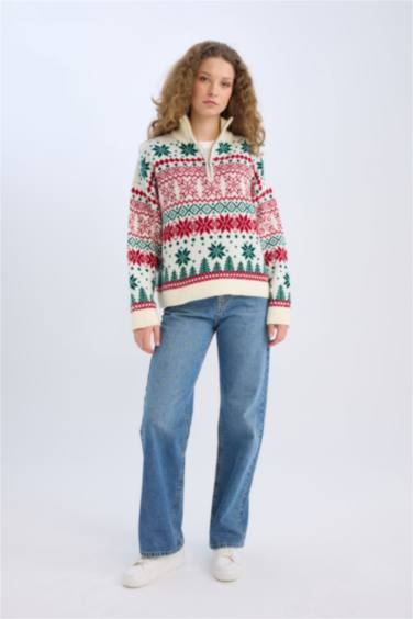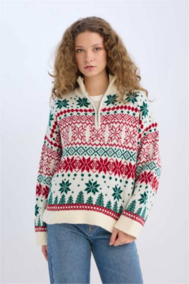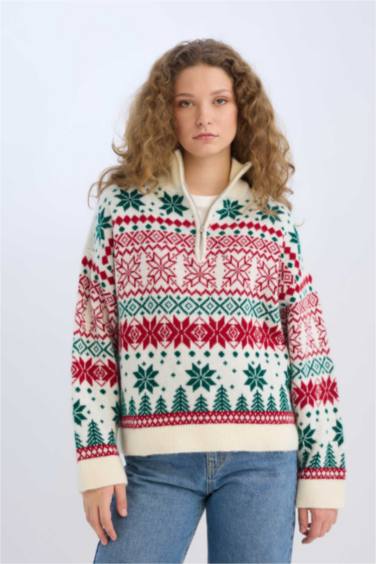 Yılbaşı Temalı Fermuarlı Dik Yaka Triko Kazak