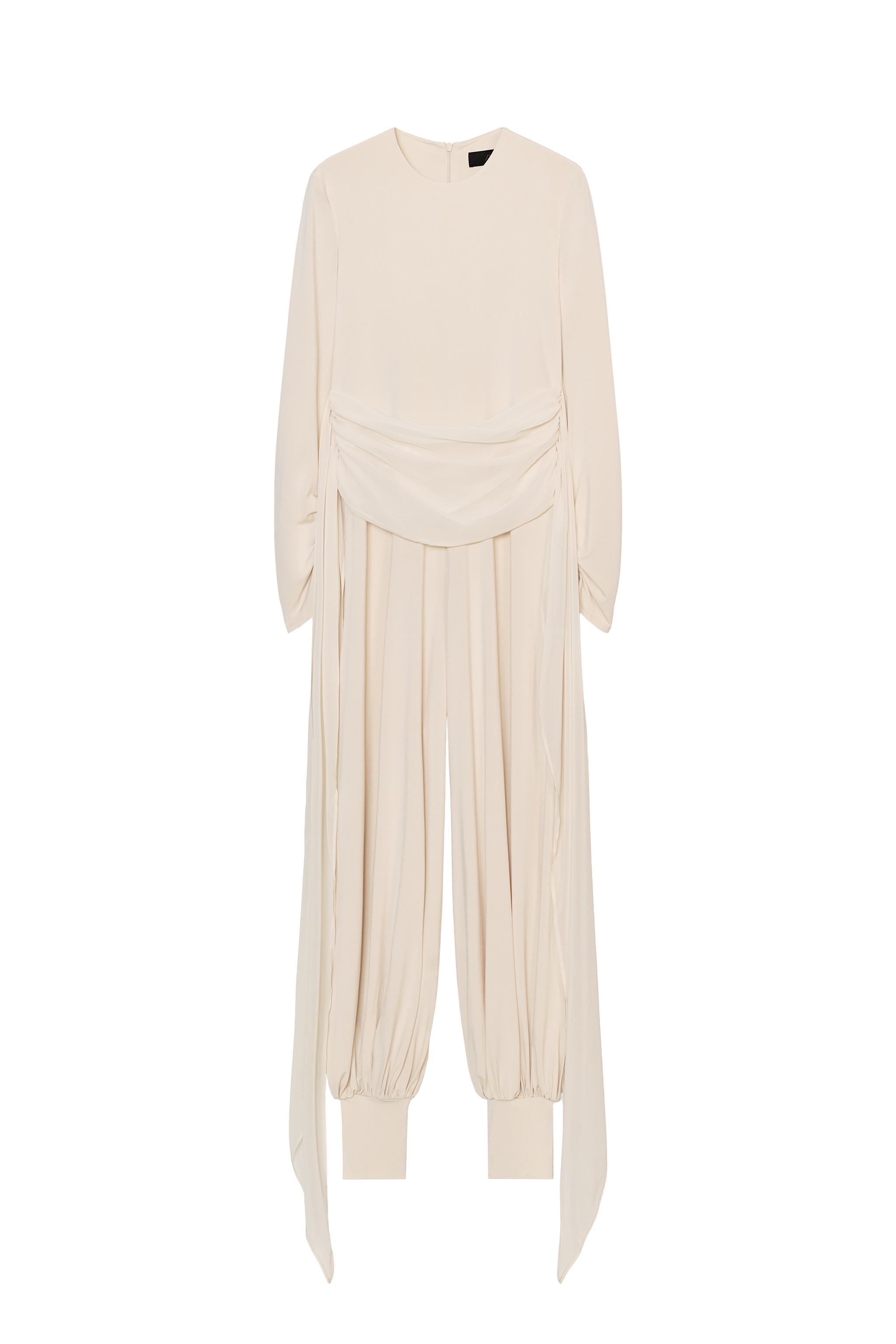 Bu drapeli kuşaklı uzun tulum, temiz hatlar ve hafif sarkma yapısıyla minimalist ve bohemian tarzın harmanlanmasından doğan bir klasik. Uzun boyu ve rahat kesimiyle hem zemin hem de üst üste giyim için ideal bir parça. Sadece bir tane bu elbiseyle, hem günlük hem de özel günlerde şık bir görünüm elde edilebilir. Uzun gövdeli tipler için idealdir; gövdenin dengelenmesine yardımcı olur. Aynı zamanda genis omuzlari olanlar için de iyi bir denge sağlar. Yaz sonu veya sonbahar başı günlerinde, beyaz tisortle ve yüksek bel jeans ile kombinleme yapabilirsin. Göz alıcı bir etki yaratırken, aynı zamanda rahat bir his verir. Tulumun renk tonu, siyah deri kemer ve beyaz sneaker ile tamamlandığında daha da modern bir hale gelir. Karanlık bir gecede ise, siyah iç çamaşırı giyerek daha ciddi bir hava yaratabilirsin. Yumuşak dokusu ve doğal taşımı sayesinde, kuru temizlik önerilir. İç katman olarak da kullanılabilir; bluz veya pullu bir montla birlikte oldukça şık bir görünüm sunar. Her zaman üzerinde durabileceğin, ama her seferinde farklı bir havaya bürünebileceğin bir parça.