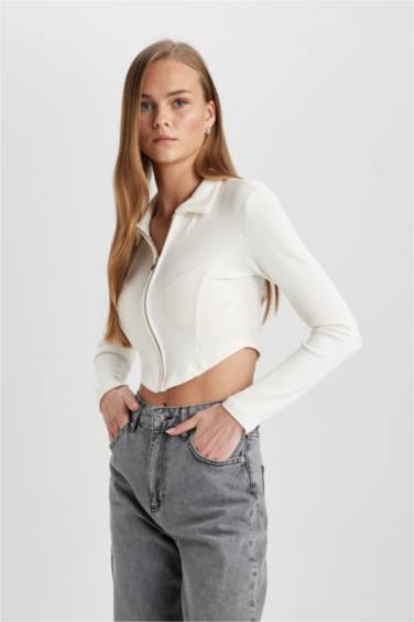 Fitted Polo Yaka Fitilli Kaşkorse Crop Fermuarlı Hırka