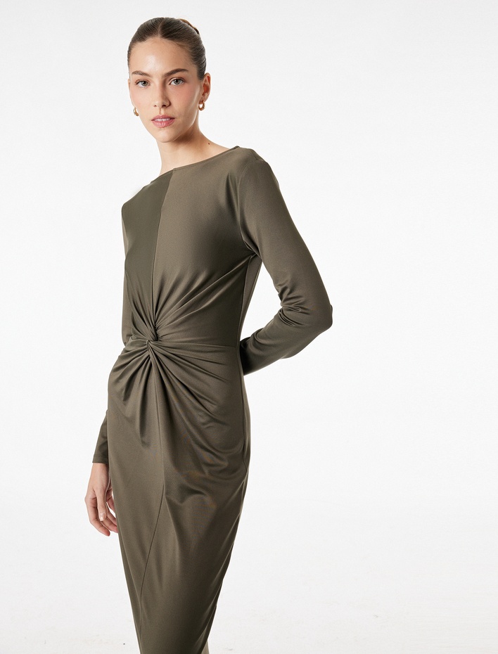 Uzun Kollu Yuvarlak Yaka Midi Boy Drape Detaylı Elbise