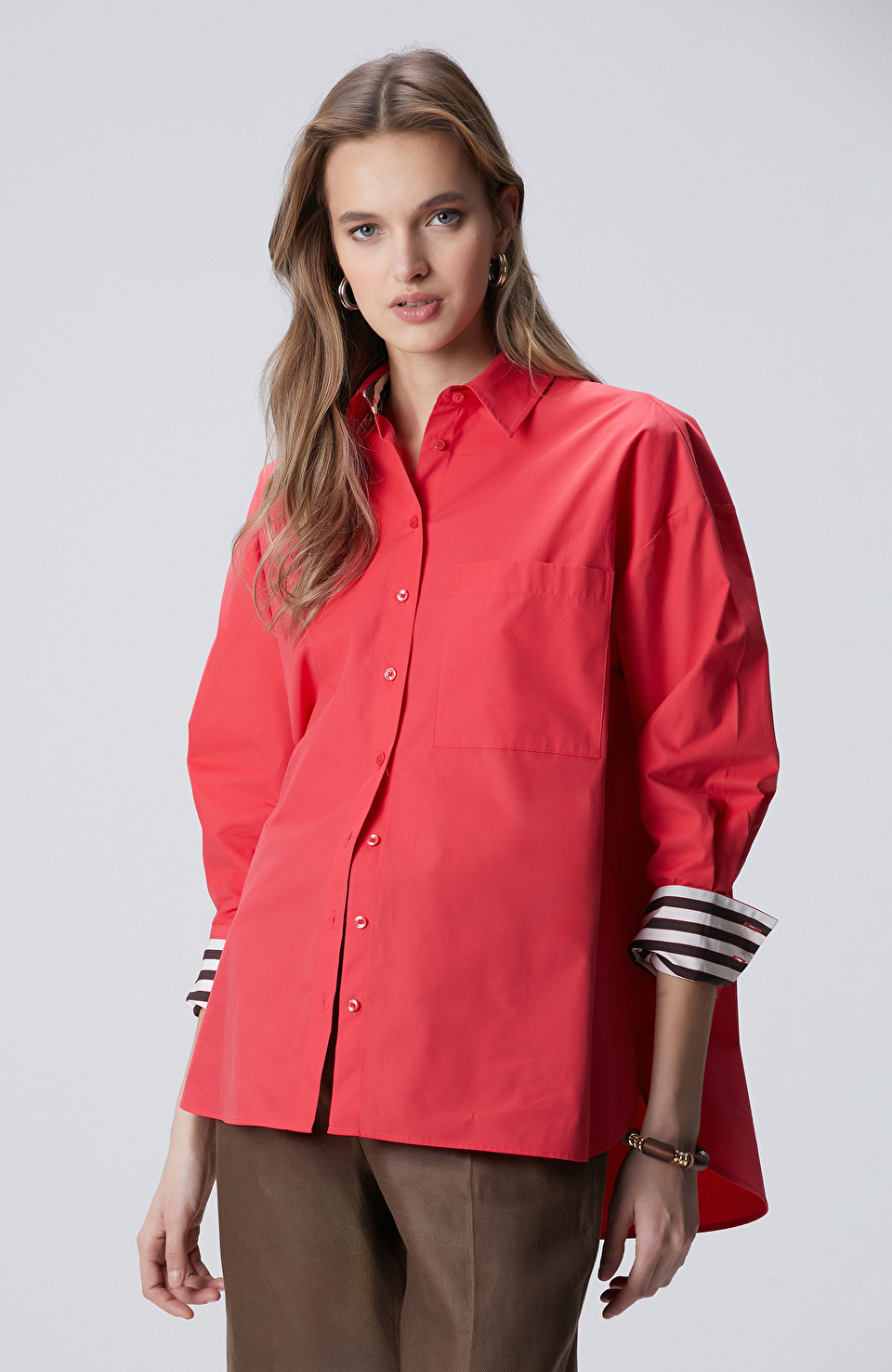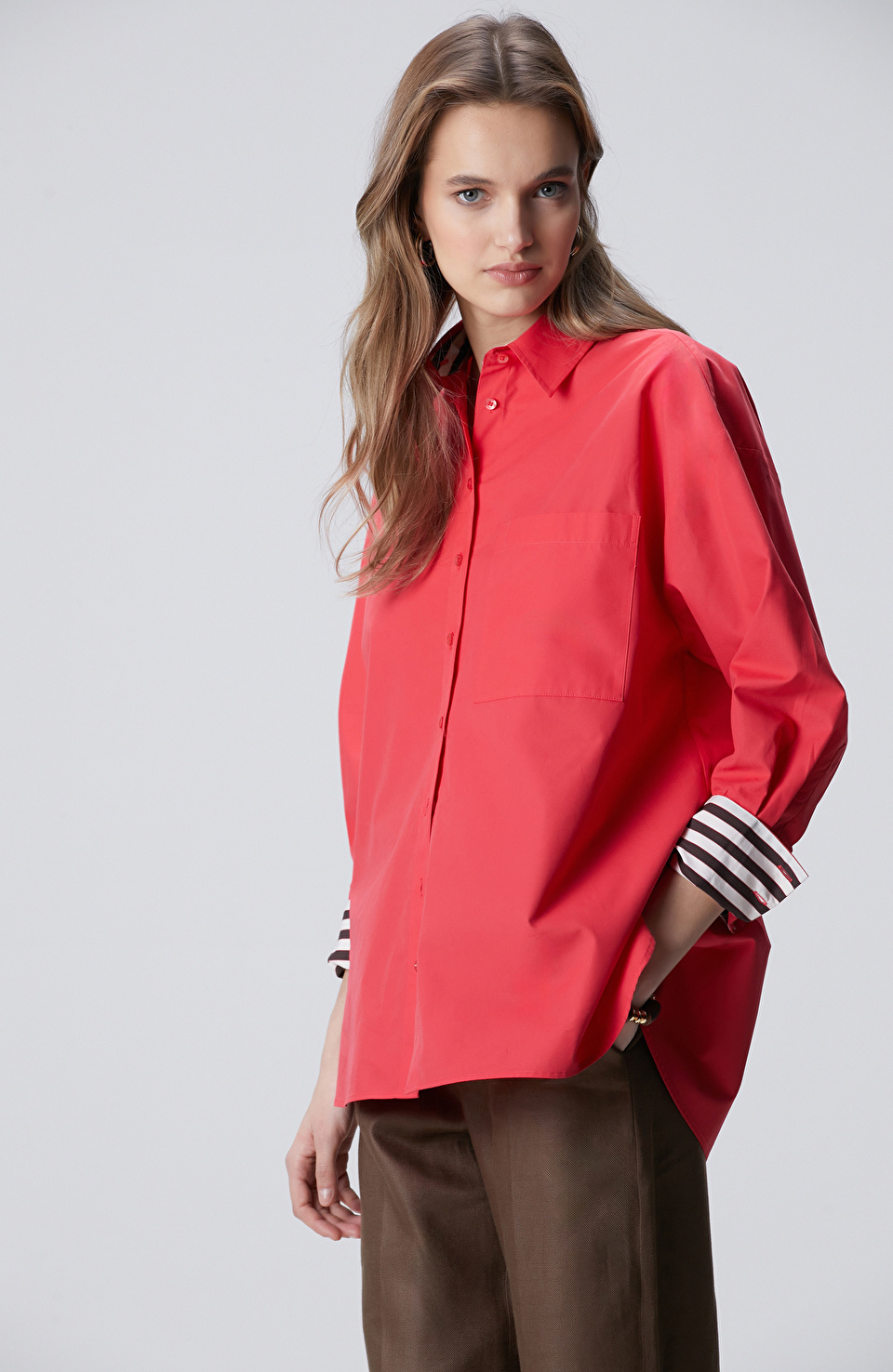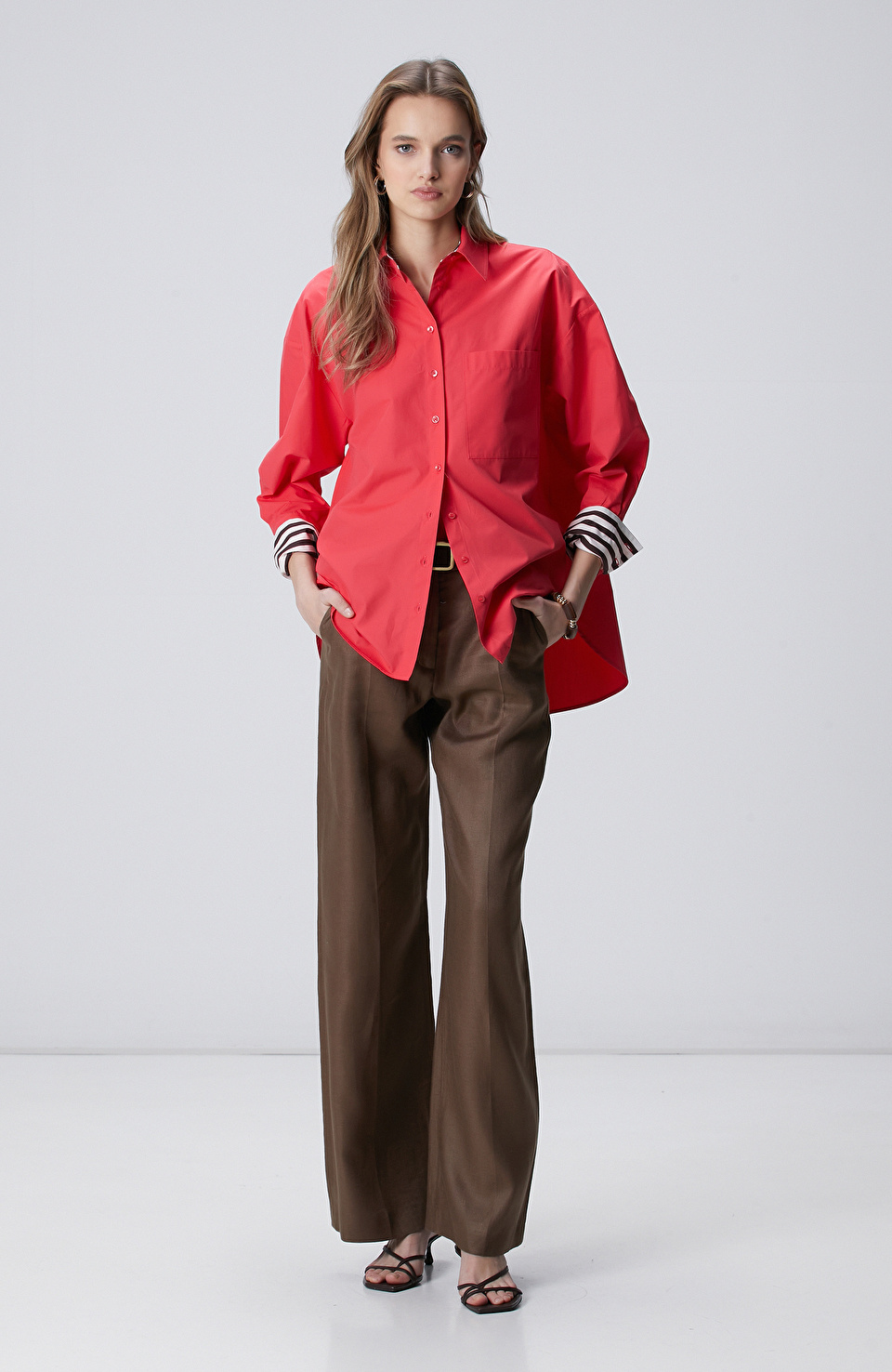 Brown-tonlu **Kumaş mix colorblock gömlek**, burgundy **Belden bağlamalı wide leg fit pantolon** ve brown **Suni deri babuç** ile dengeli, rahat ama etkili bir kombin.