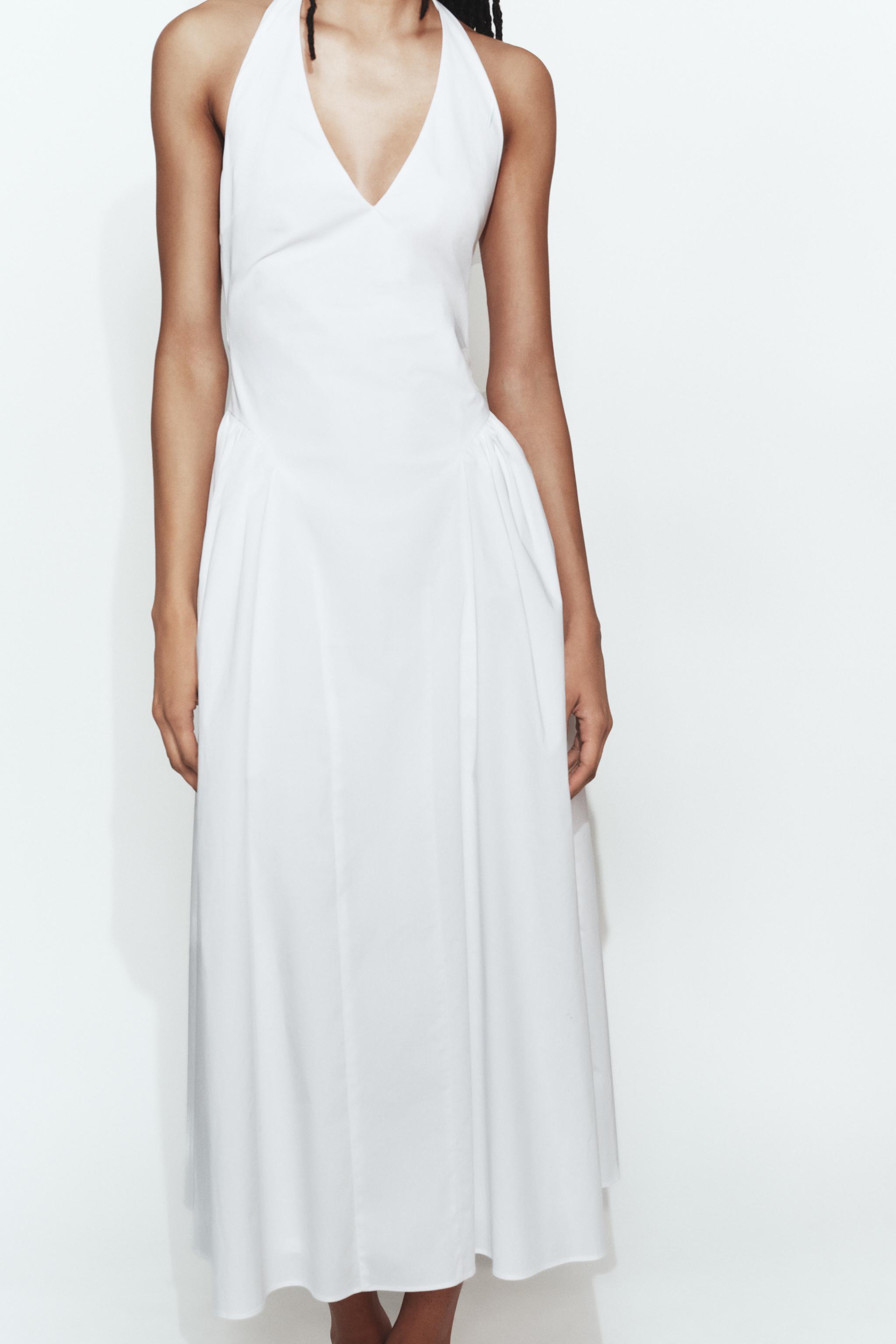 Beyaz poplin halter yaka elbise, temiz hatlar ve minimal detaylarıyla her zaman şıklığın simgesi olabilir. Uzun gövdeli tipler için idealdir; omuz çizgilerini dengeliyor ve vücut hatlarını zarifçe vurguluyor. Günlük kullanım için beyaz tisörtle ve yüksek bel jeans ile kombinleyebilirsin; bu kombine, ofis-sonrası bulușmalarda da rahatça giyilebilir. Parti veya yemek gececine ise siyah deri kemer ve beyaz sneaker ile tamamlayarak daha şık bir hale getirebilirsin. Elbisenin dokusu nedeniyle katlanmadan asmalı, iç katman olarak da kullanılabilir. Klasik ve glamours stilin harmanlandığı bu model, hem mevsimsel hem de durumsal olarak çok yönlü bir seçim.