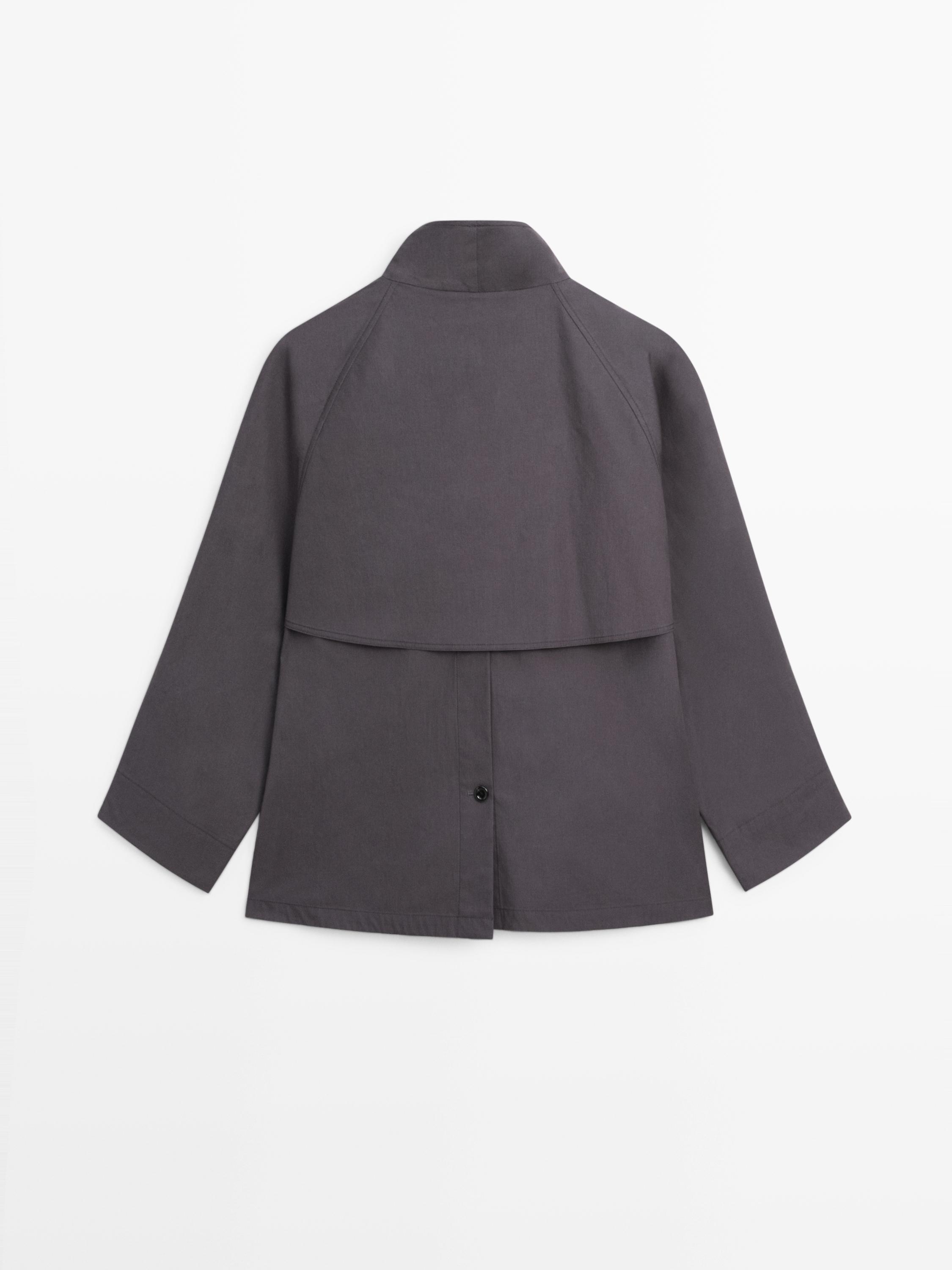 Bu kısa pamuklu pelerin ceket, temiz hatlari ve narin dokusuyla minimalist tarzda klasik bir eklenti sunuyor. Uzun govdeli tipler icin ideal olmasinin yaninda, genis omuzlari dengelemek icin de cok uygun. Sadece bir parca ile cok etki yaratabileceginiz bu ceket, ofis-sonrasi bulusmalarda veya sonbahar aksam yuruyuslerinde hafif bir koruma ve stil katmanı olarak harika duruyor. Beyaz tisortle ve yuksek bel jean ile kombinleme yaparsaniz hem rahat hem de cok modayla gidebilirsiniz. Ayni zamanda siyah bir pantolonla da cok dengeli bir gozukme saglayabilirsiniz. Koyu gri rengiyle baska renkli aksesuarlarla oynayabilirsiniz; siyah deri kemer ve beyaz sneaker ile tamamlayabilirsiniz. Ceketi katlanmadan asmali, cikarma islemiyle kolayca kullanabilirsiniz. Ic katman olarak da giyilebilir, bu sayede mevsimsel degisimleri daha esnek bir sekilde karsilayabilirsiniz.