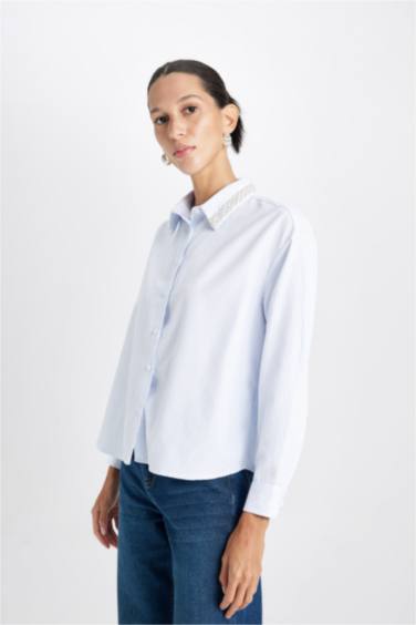 Oversize Geniş Kalıp Çizgili Yaka Boncuklu Oxford Uzun Kollu Gömlek