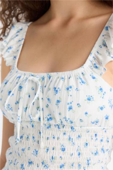 Coool Fitted Çiçekli Kare Yaka Dokulu Kolsuz Bluz