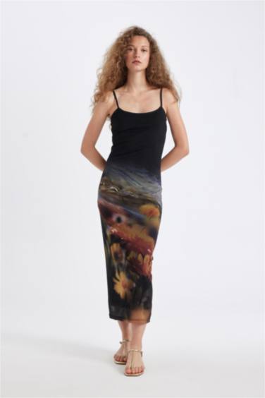 Bodycon Vücudu Saran Askılı Desenli Tül Askılı Maxi Elbise